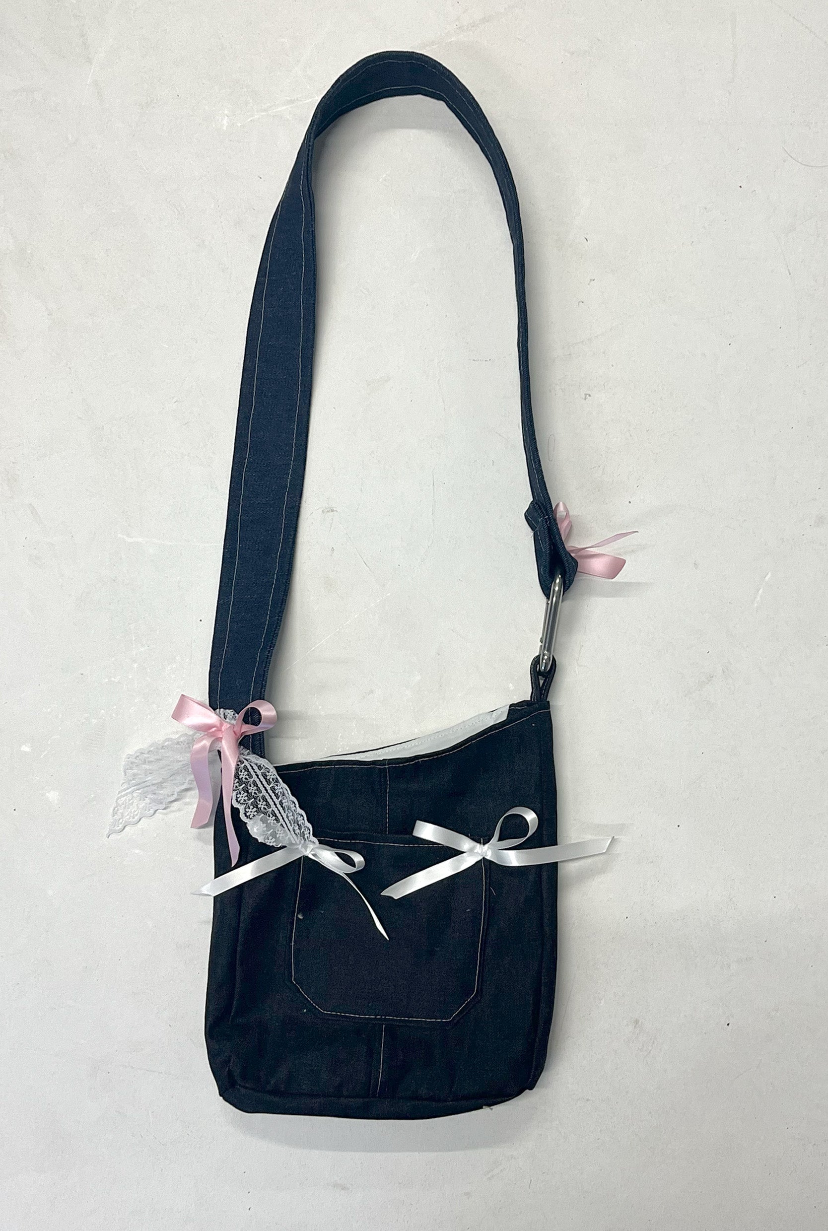 Indigo cross body bag created out of dead stock selvedge denim. Bow adorned with multi-style pockets and metal hardware. This is a smaller style bag, perfect for carrying the essentials.