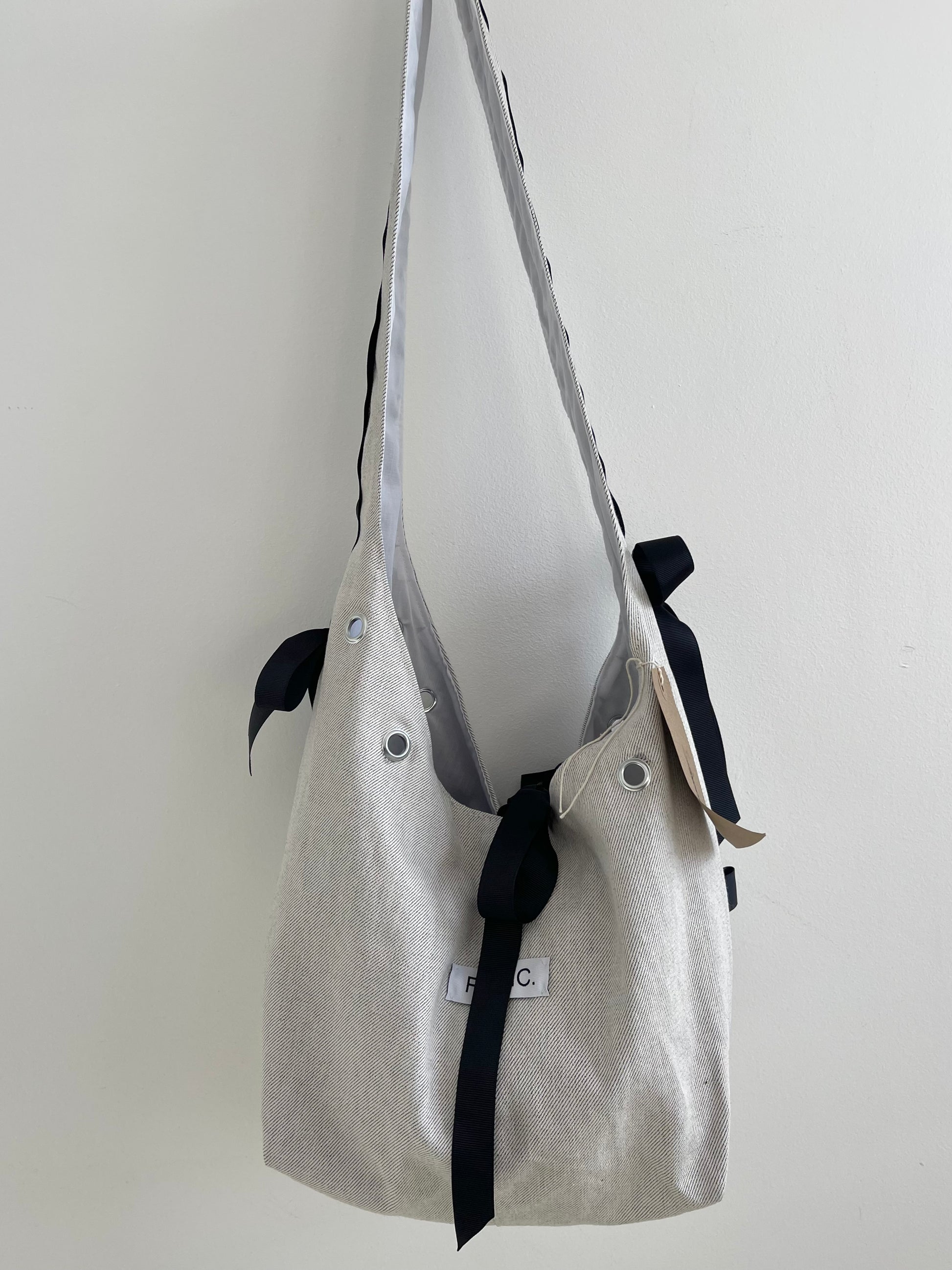 Created out of a limited amount of grey, dead stock denim. Cross body or shoulder bag, can fit both.
