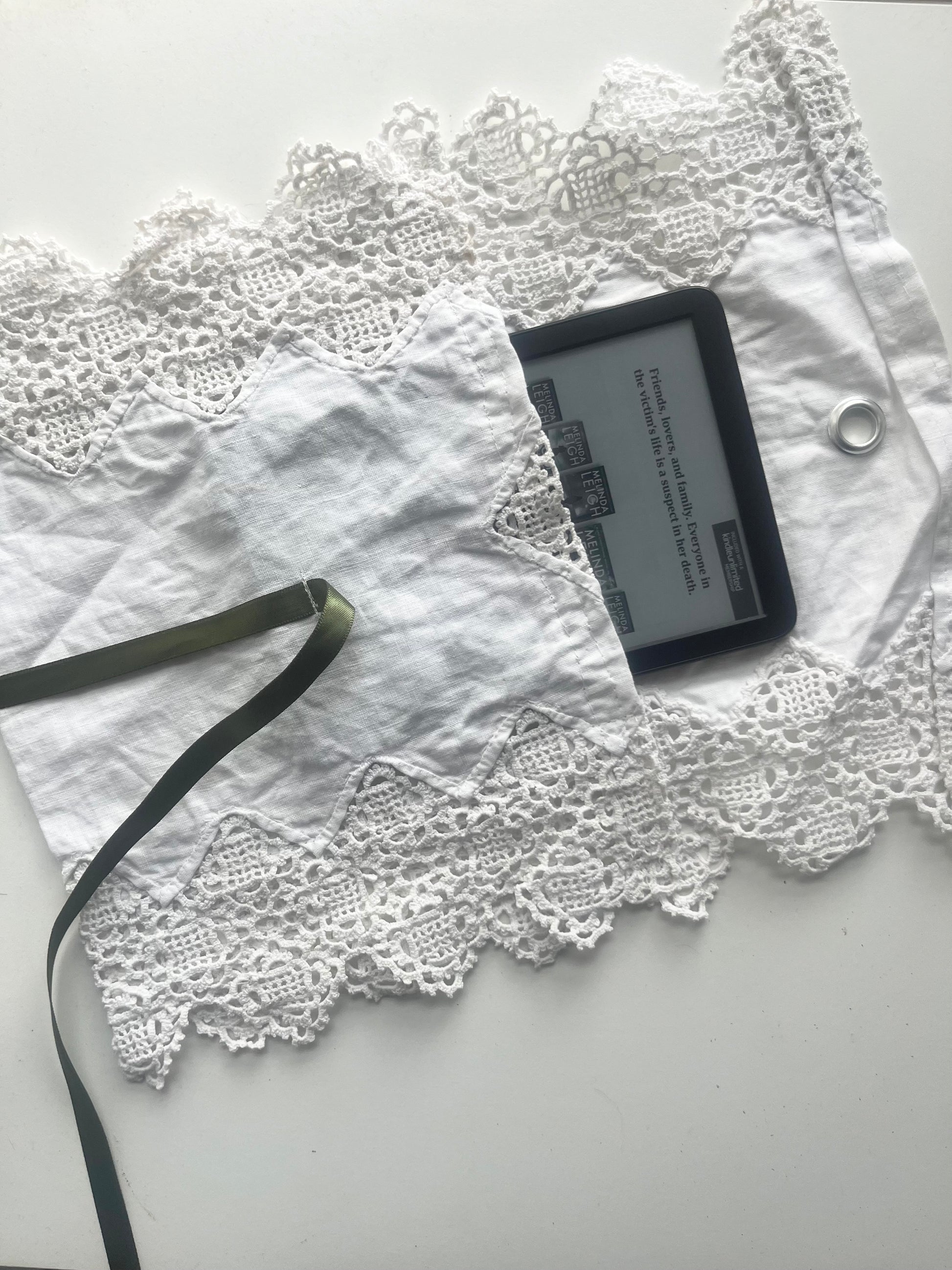 Gorgeous crochet, lace kindle sleeve. Fastened with a flap and a ribbon. Created out of a vintage table runner.